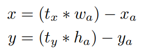 YOLOv1에서 anchor box를 사용하면 초기 box의 좌표가 random하게 설정되어 초기 학습에 어려움이 있다. region proposal network에서는 아래식과 같이 tx, ty를 예측한다. 여기서 x와 y는 bounding box의 중심점이다.