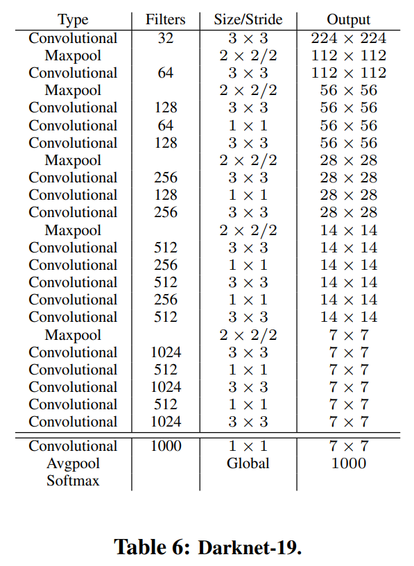 위에서 언급한바와 같이 YOLOv2에서는 google net이 아닌 darknet-19를 사용하였다. 이 논문이 나올 당시 대부분의 사람들은 VGG net을 사용하였다. dark net을 사용한 이유는 1*1 filter 연산과 같이 bottleneck이 사용되었기 때문이다. bottleneck을 사용하면 연산에 사용되는 파라미터의 수가 줄어드는것과 동시에 계산의 효율성이 매우 좋아진다. 이것은 또한 the power of small filter 법칙과 연관이 되는데 이는 필터가 작을 수록 연산 효율이 더 좋아지는 이론이다. bottle neck과 the power of small filter에 대해 처음들어보았거나 원리에 대해 더 자세히 알고 싶으면 https://ys-cs17.tistory.com/20를 40p부터 참고하기바란다. classification 정확도 측면에서는 top-5 error를 93.3%를 기록하였다.
