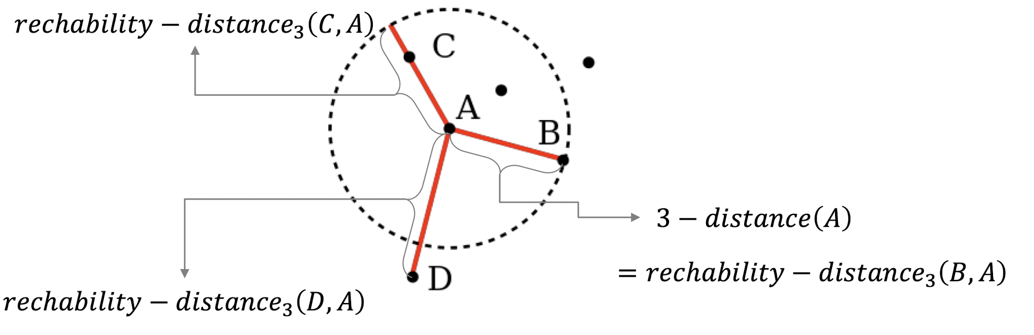 $k\text{-distance}(A)$는 $A$로부터 $K$번째 근접 이웃까지의 거리를 의미한다.