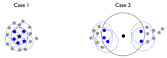 case 1에서 검은색 점 $p$에 대한 reachability distance는 검정색 반경이고, $p$의 이웃인 파란색 점들에 대한 reachability distance는 파란 점선 반경이다.