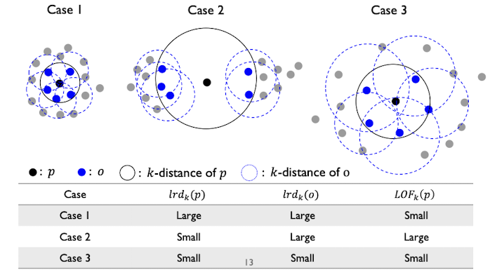 case 3을 보면 상대적 밀도는 크다. 하지만 $lrd_{k}$를 계산하게 되면 밀도가 낮은 영역이기 때문에 $p, o$에 대한 $lrd_{k}$가 작아지게 된다.