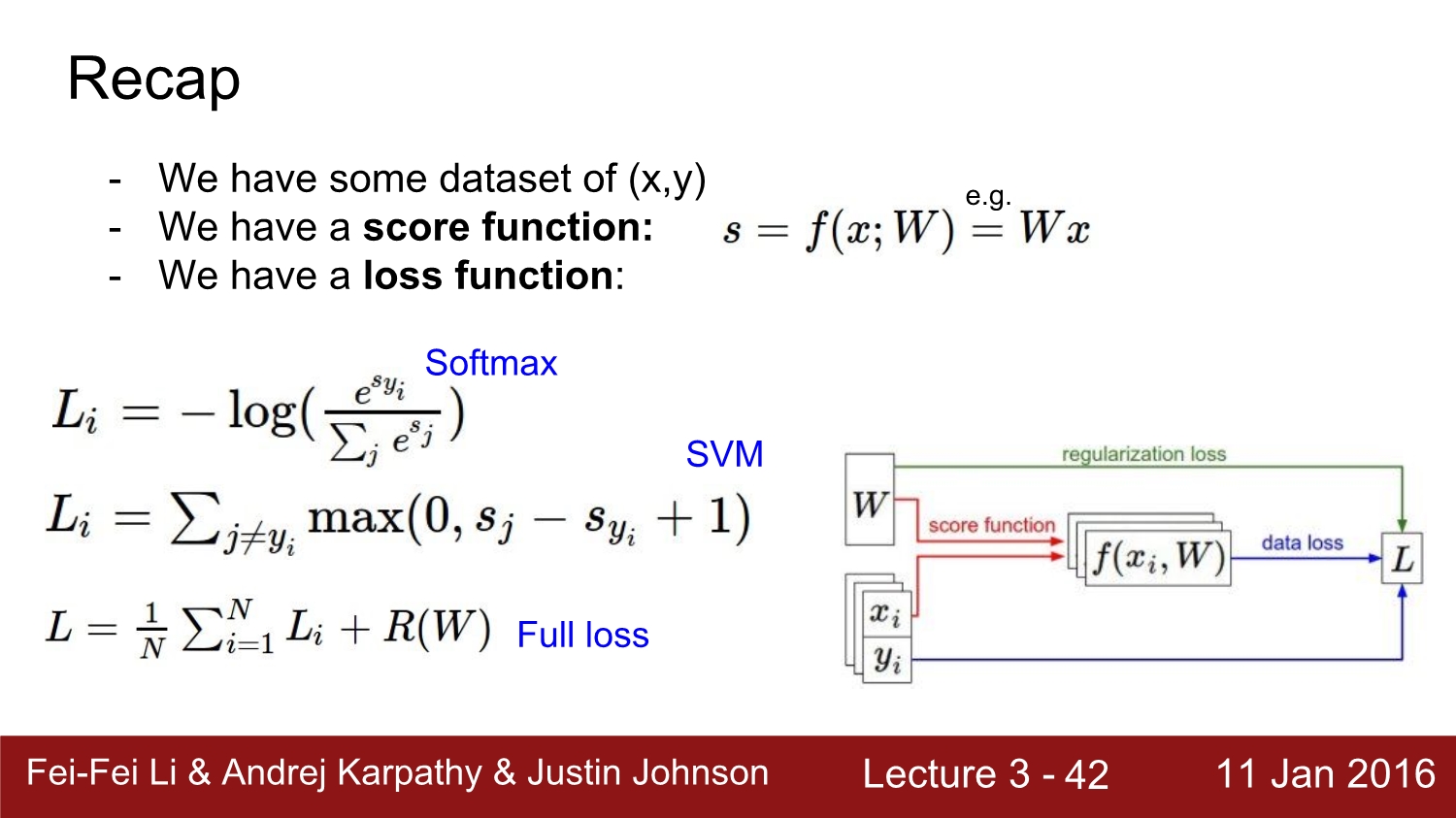 lecture 3에서는 lecture 2에 이어서 loss function과 optimization에 대해 리뷰하겠다.