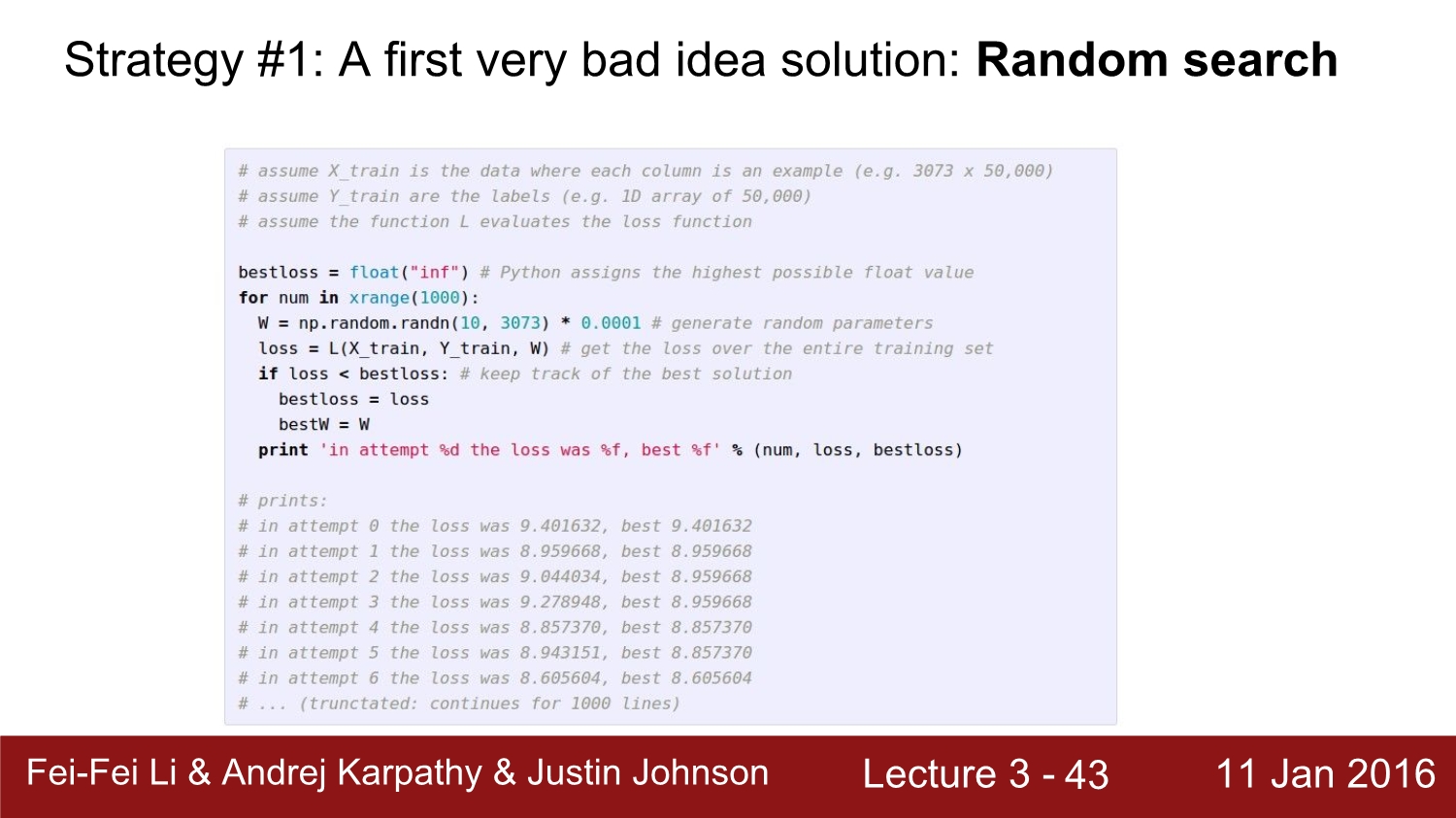 optimization 방법 중 하나인 random search는 말 그대로 weight를 random 하게 하는 것이다. 이는 절대로 쓰면 안 되는 방법이다.