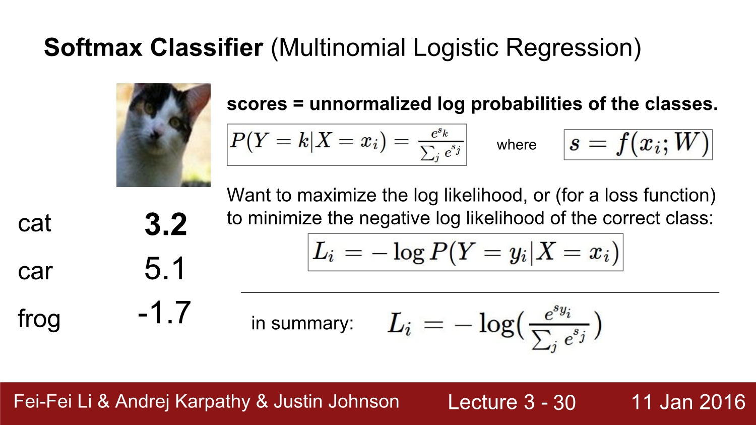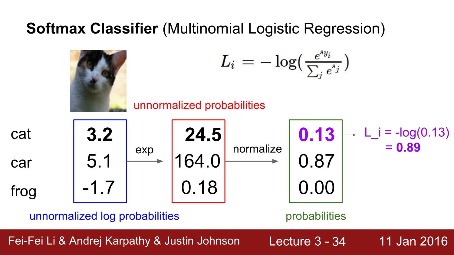 cat에 대한 loss를 softmax를 하여 loss를 계산해보면 우선 처음에는 exp를 해주고 2번째는 normalize후 cross entropy를 통해 최종적으로 cat에 대한 0.89를 얻었다.