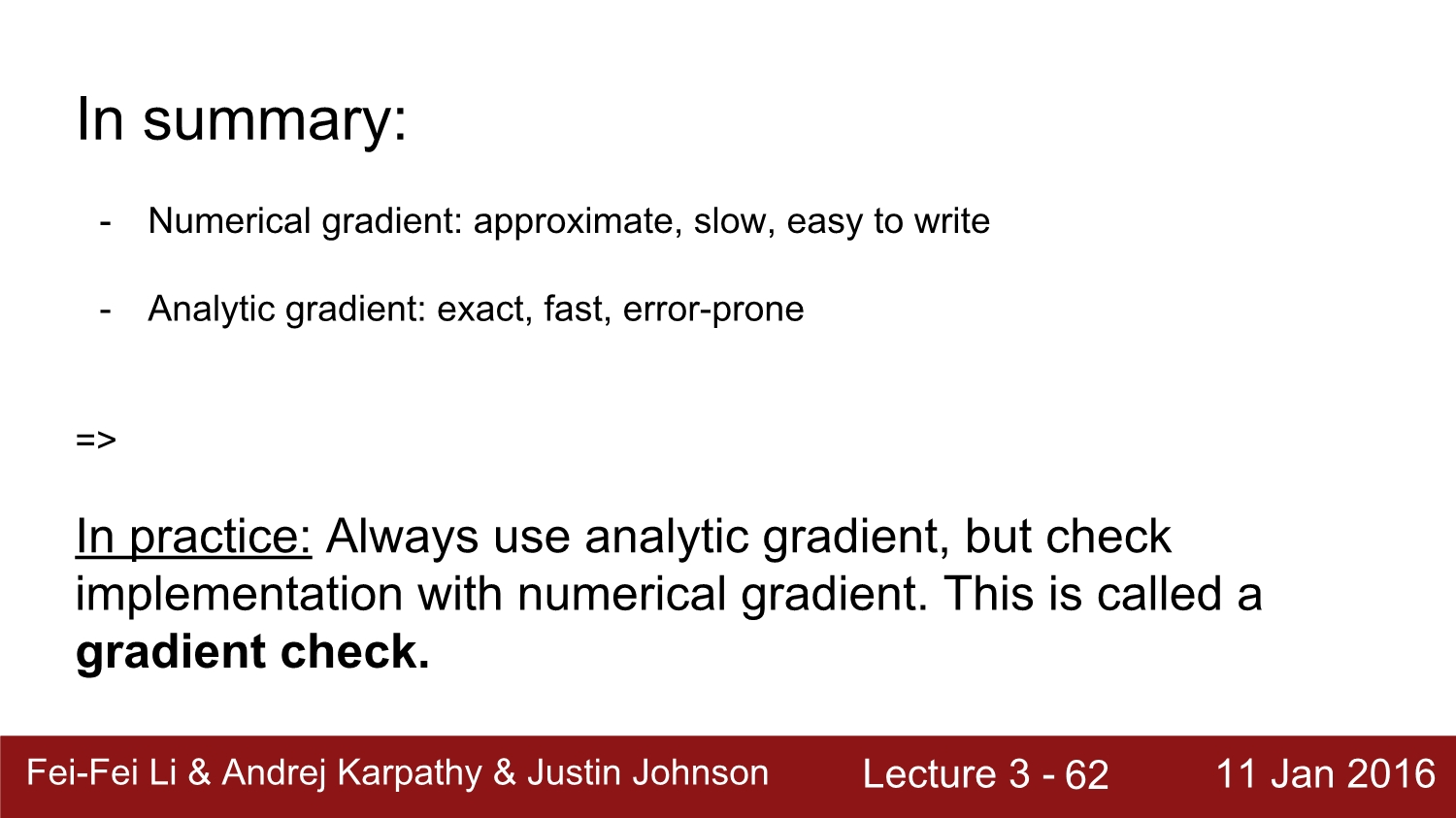 따라서 우리는 numerical gradient를 사용하지 않고, analytic gradient를 사용한다. 하지만 numerical graident는 코드로 구현하기 쉽고, analytic gradient의 값을 확인할 때 사용한다.
