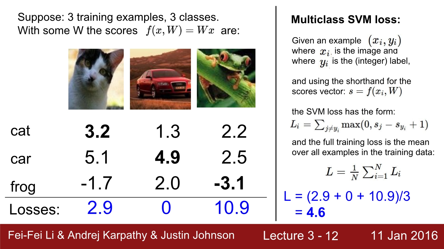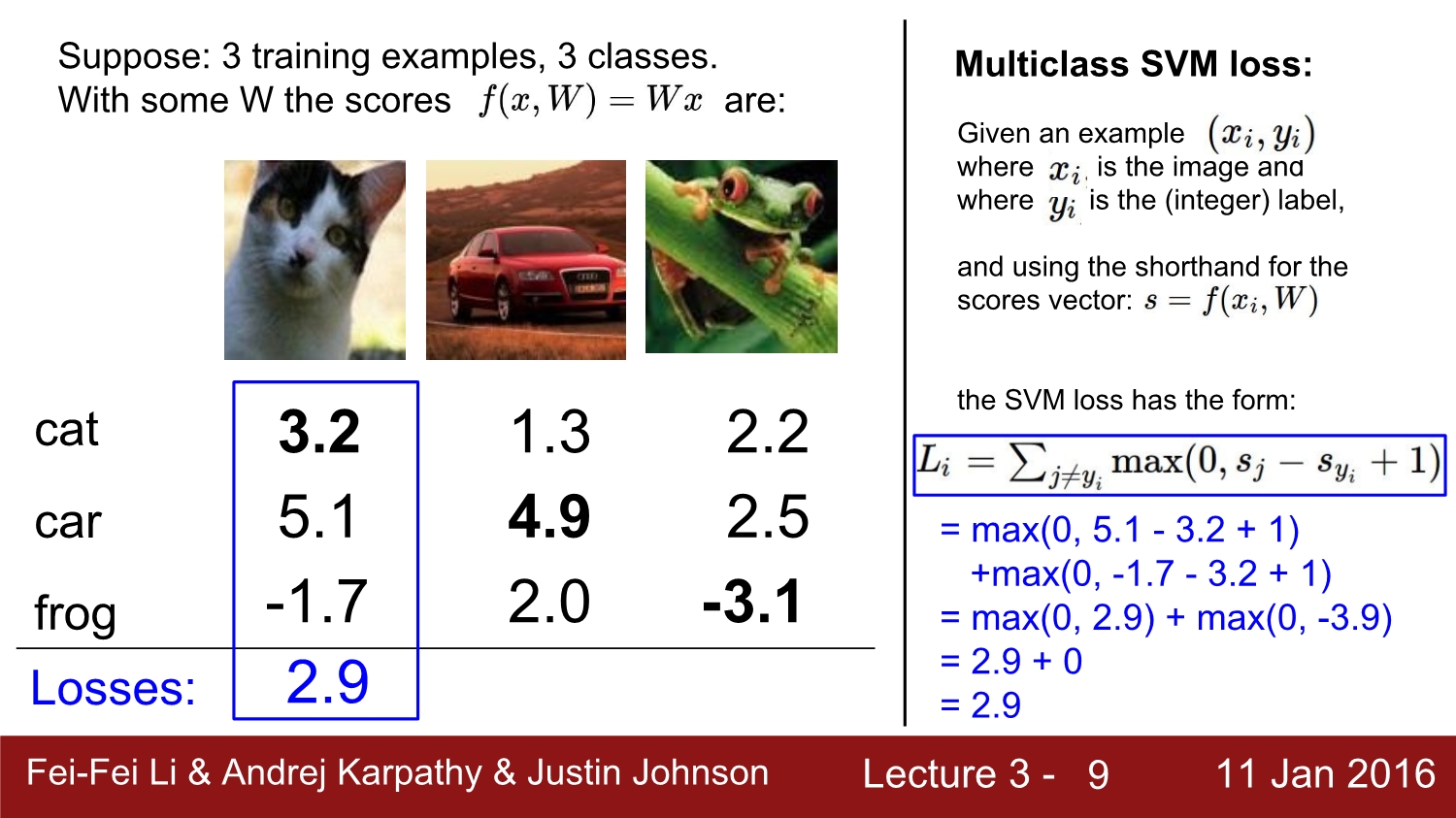 SVM은 위와 같이 정의되며 첫 번째 cat에 대한 loss는 계산을 하면 2.9가 된다.