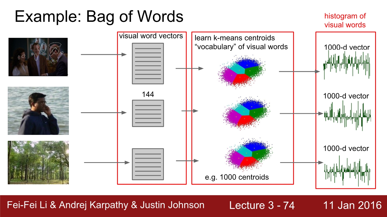 Bag of words는 우선 이미지의 작은 local patch를 보고 벡터를 통해 사전을 만든다. 그리고 가장 유사하게 생긴 이미지를 k-means를 통해 찾고, linear classifier를 사용하여 구별한다.