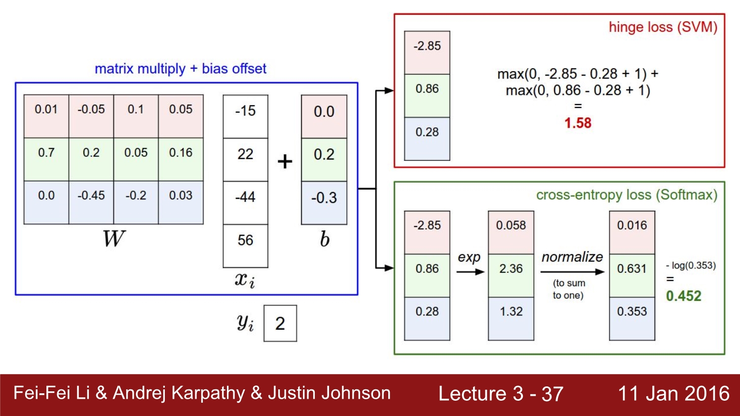 최종적인 loss를 SVM과 Softmax를 비교하면 각각 1.58, 0.452가 나온다.