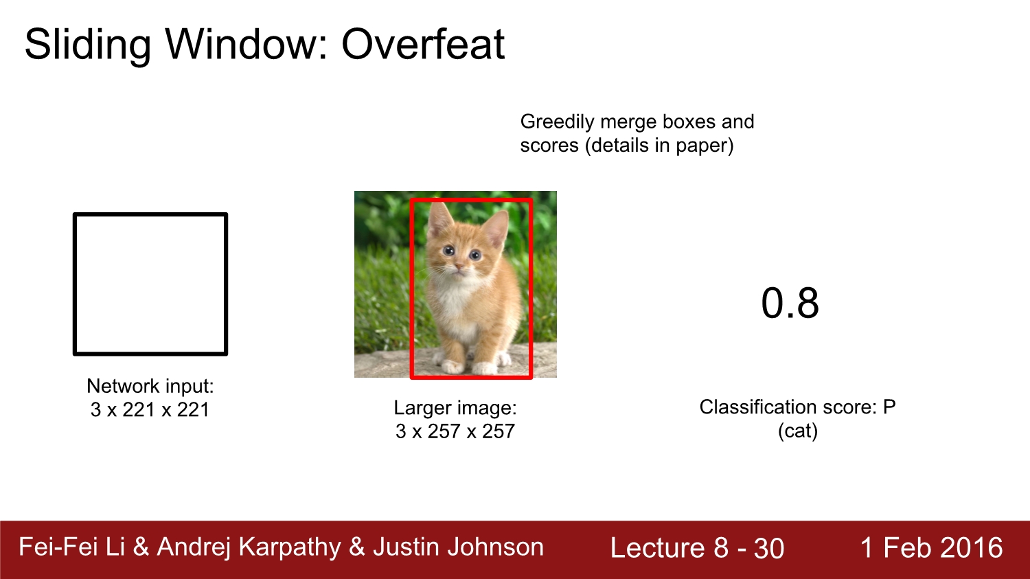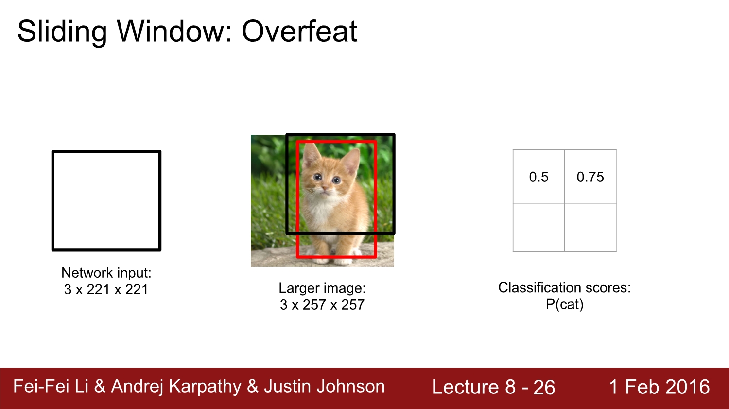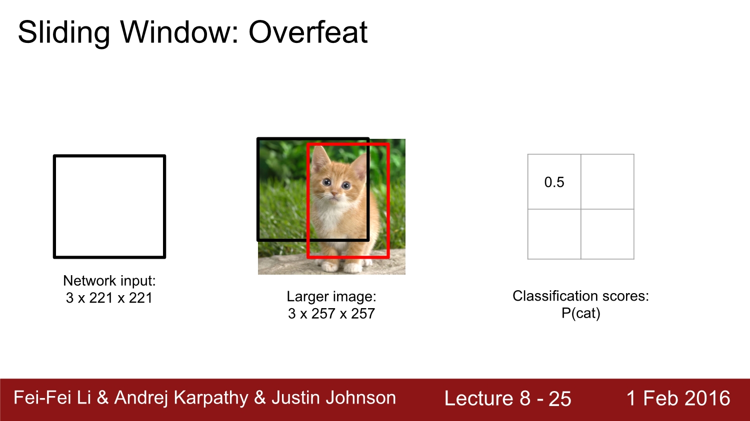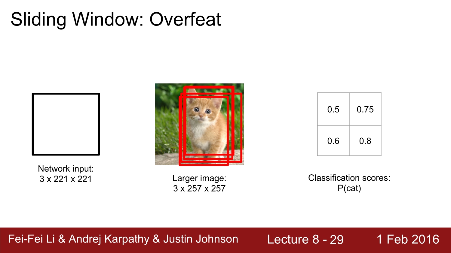 2013년 우승 모델인 overfeat에 대해 알아보자. 해당 network는 alexnet과 유사하다. 이 경우에는 크기가 더 큰 image가 더욱 정확도가 높다고 한다. 아래 그림을 보면 검은색 box가 sliding window이고, 둘 다 겹치는 부분에서 score를 구한다. 그다음에는 window를 sliding 하여 다음 영역에 대한 score를 구한다. 이를 모든 이미지에 대해서 진행한다.