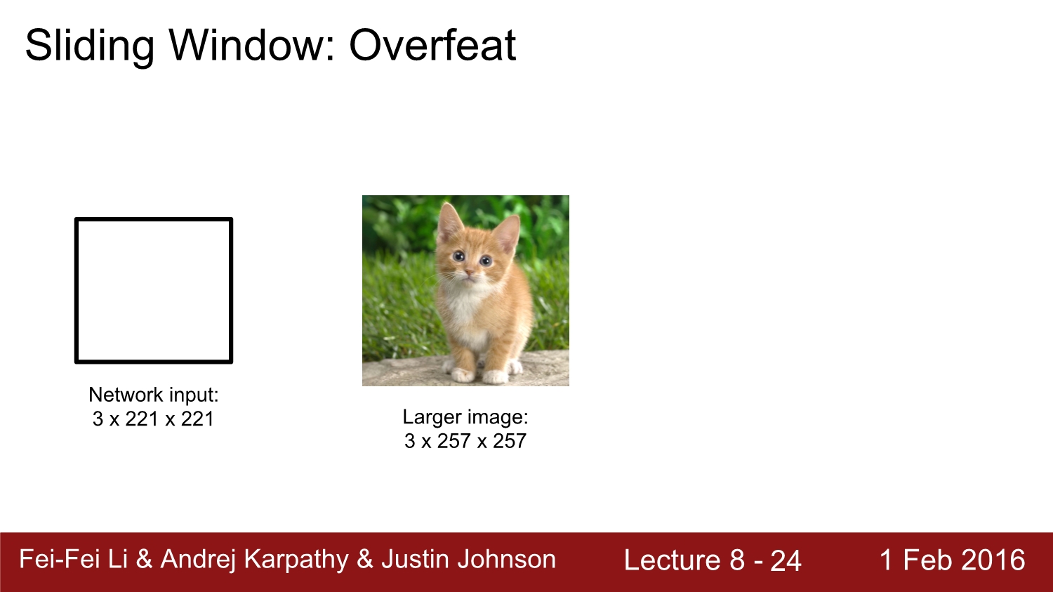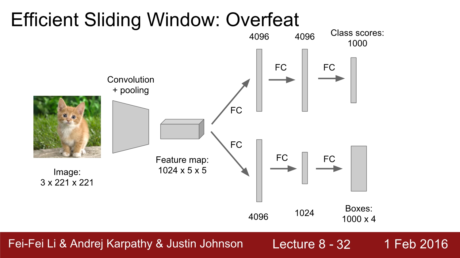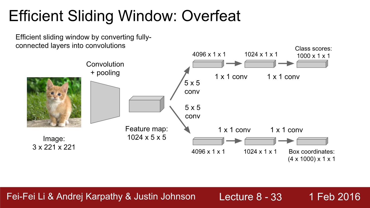 다음은 2번째 방법인 sliding window이다. 기본적으로 regression 방법과 동일하게 2개의 head로 구성되어 있고, image의 여러 부분에 위치한 window를 여러 번 돌려서 합쳐준다. 그리고 편의성을 위해 맨 마지막 layer인 fc layer를 conv layer로 변형시켜서 진행한다.