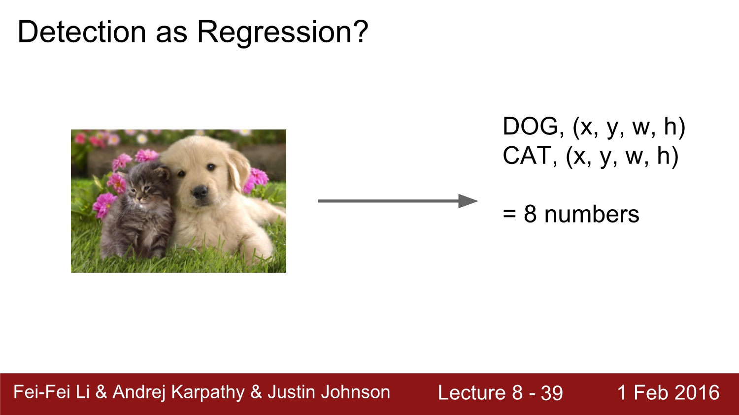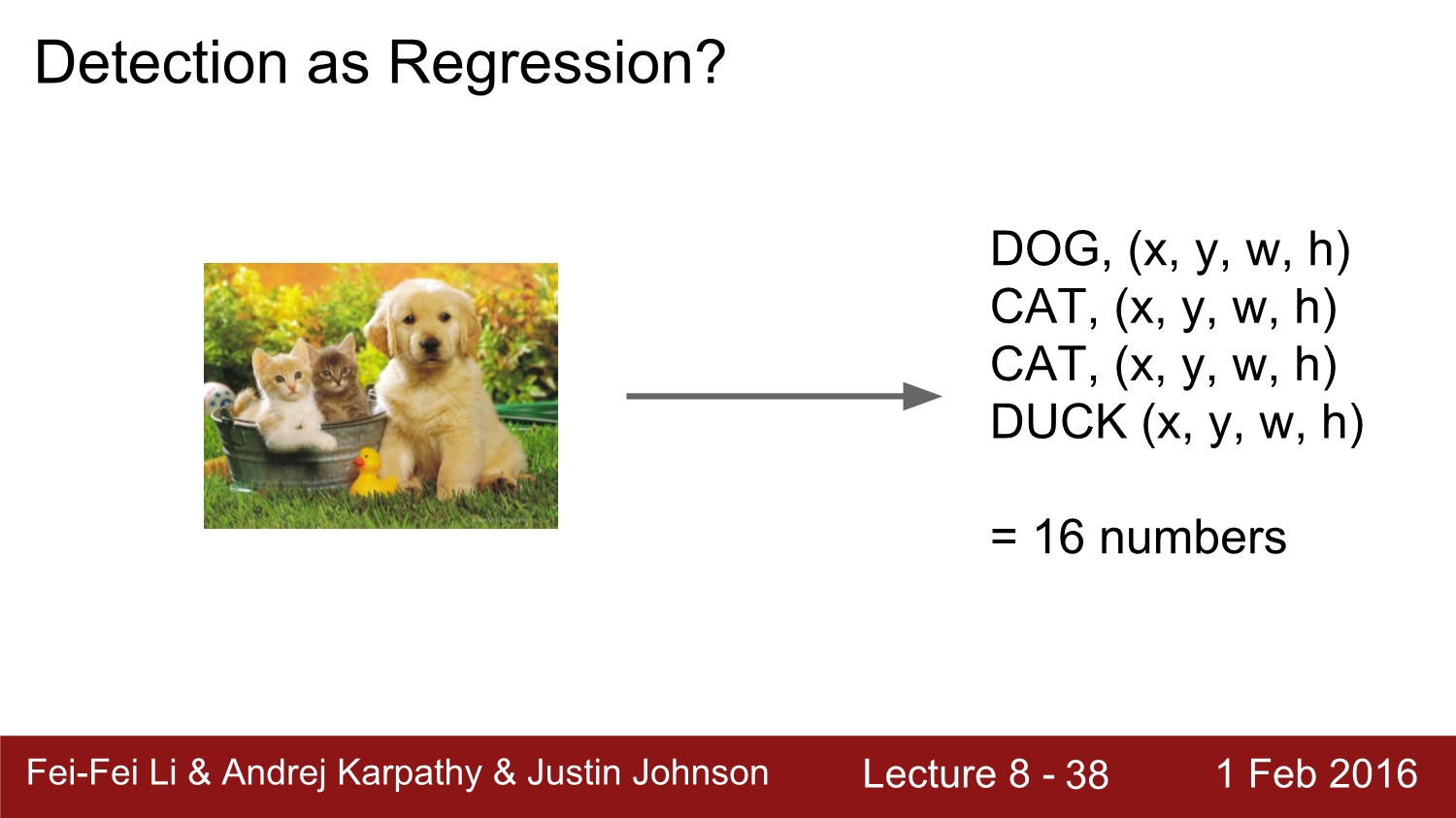 앞에서 regression이 매우 잘된 것이 확인되었다. 그래서 이 regression은 object detection에서 활용을 해보는 것은 어떨까? 만약에 image에 object가 4개 존재하면 output 좌표는 총 16개가 나오게 된다.