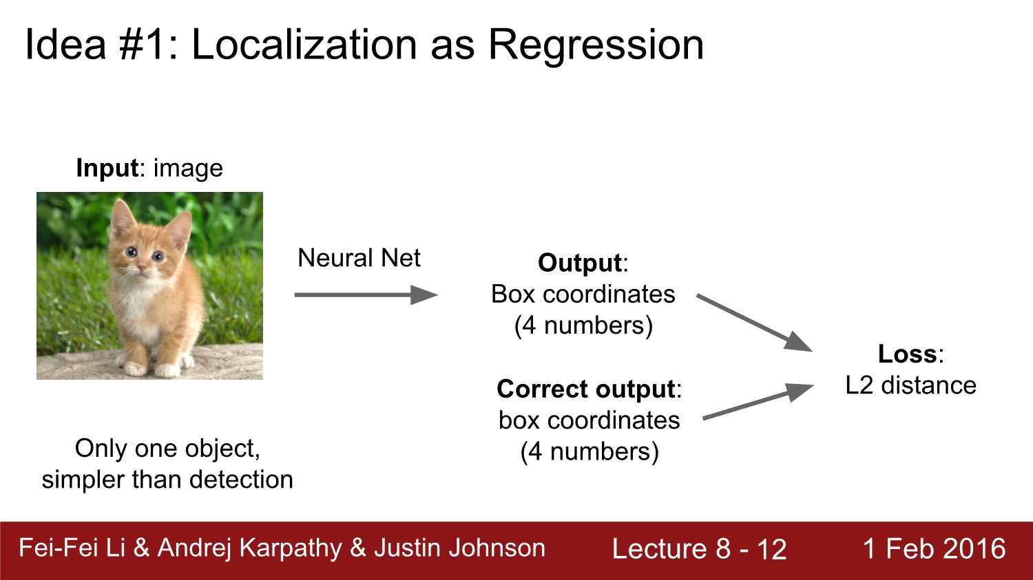 Localization을 하는 방법 중 첫 번째 방법인 Localization as Regression에 대해 살펴보자. regression는 k개에 대한 물체를 localization 할 때 detection에 대해 신경을 쓰지 않아도 된다. 그 이유는 이 방법은 input image를 넣었을 때 output으로 나오는 box 좌표와 정답 box 좌표의 loss를 비교하며 backpropagation을 통해 update 하여 최적화를 진행한다.