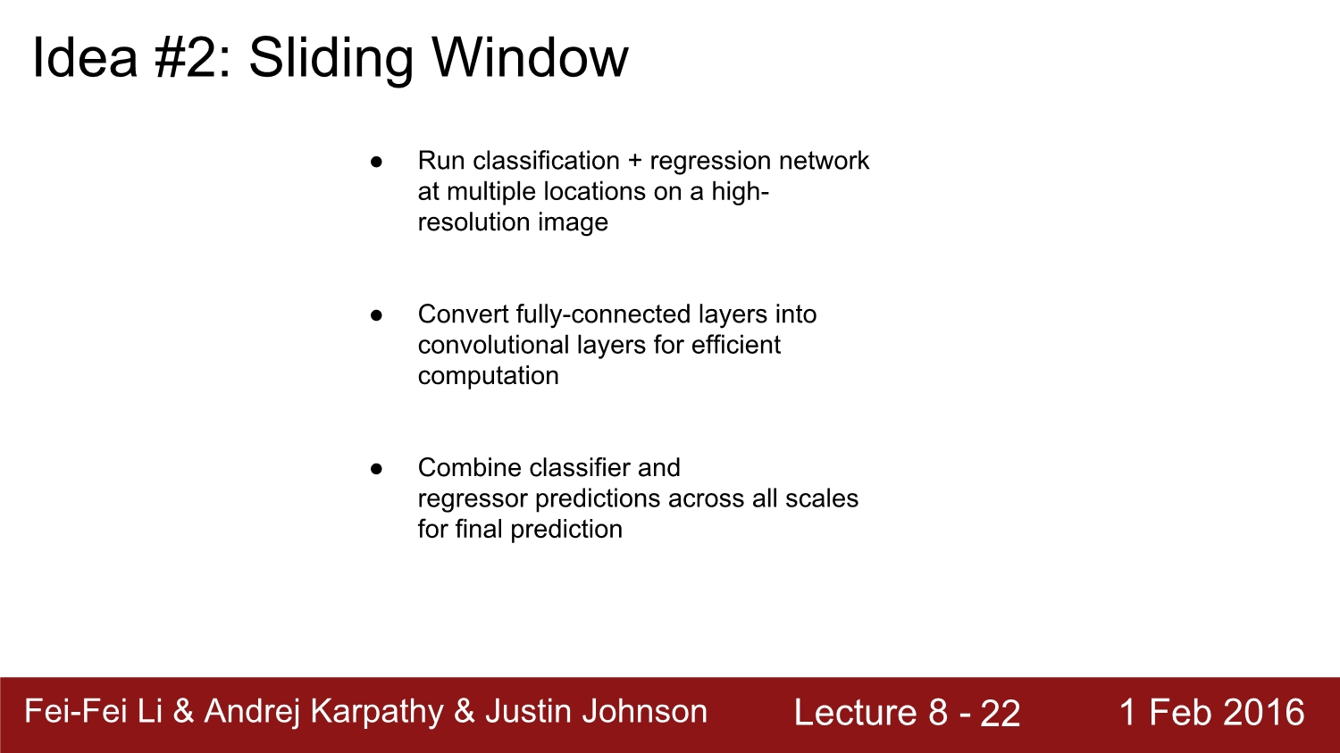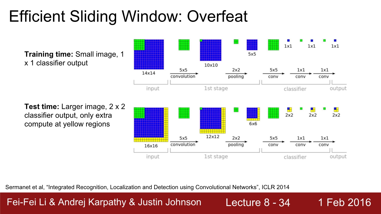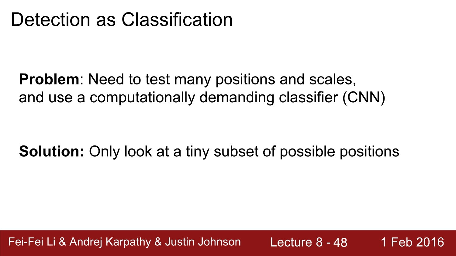 이러한 방법으로 classification으로 접근하였을 때 문제점은 가급적 다양한 size의 많은 window를 활용하기 때문에 너무 많은 test case가 나오게 된다. 이에 대한 해결책은 그냥 진행해도 된다. 왜냐하면 이 방법은 그렇게 무겁지 않기 때문이다.