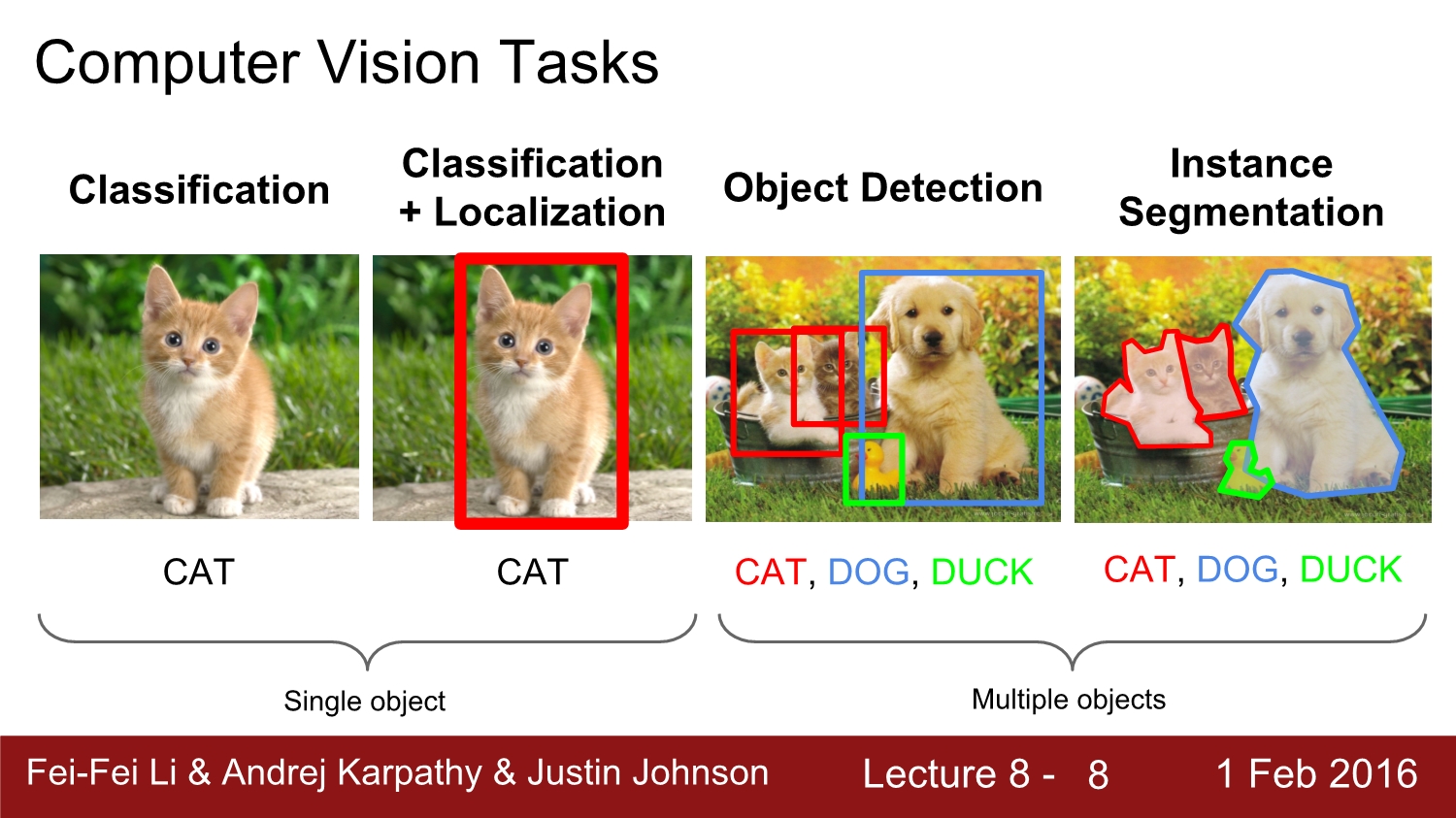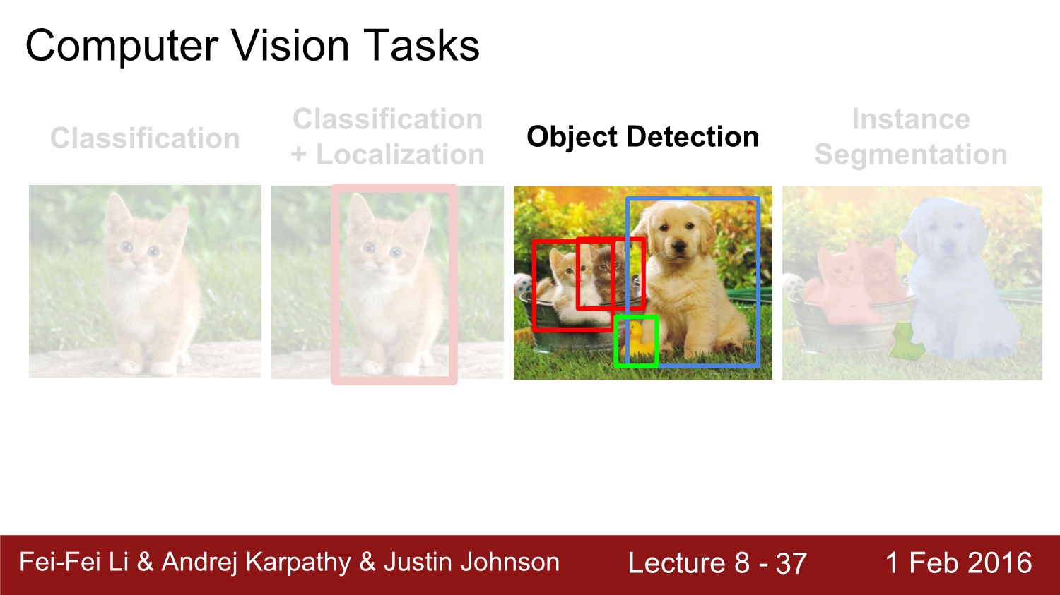 세 번째인 object detection은 2번째 classification+localization과 비슷하지만 차이점은 여러 object를 detecting 할 수 있는 점이다.