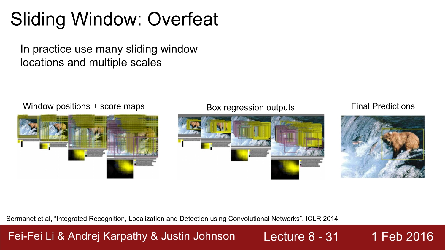 실제로는 매우 많은 window를 이용하여 score를 구하게 되고, 이를 통해 score map을 작성하게 된다. 위 예시 같은 경우에는 곰 쪽에서 큰 score의 분포를 볼 수 있다. 하지만 수많은 window를 사용하게 된다면 연산에 대한 속도는 매우 커지게 된다.