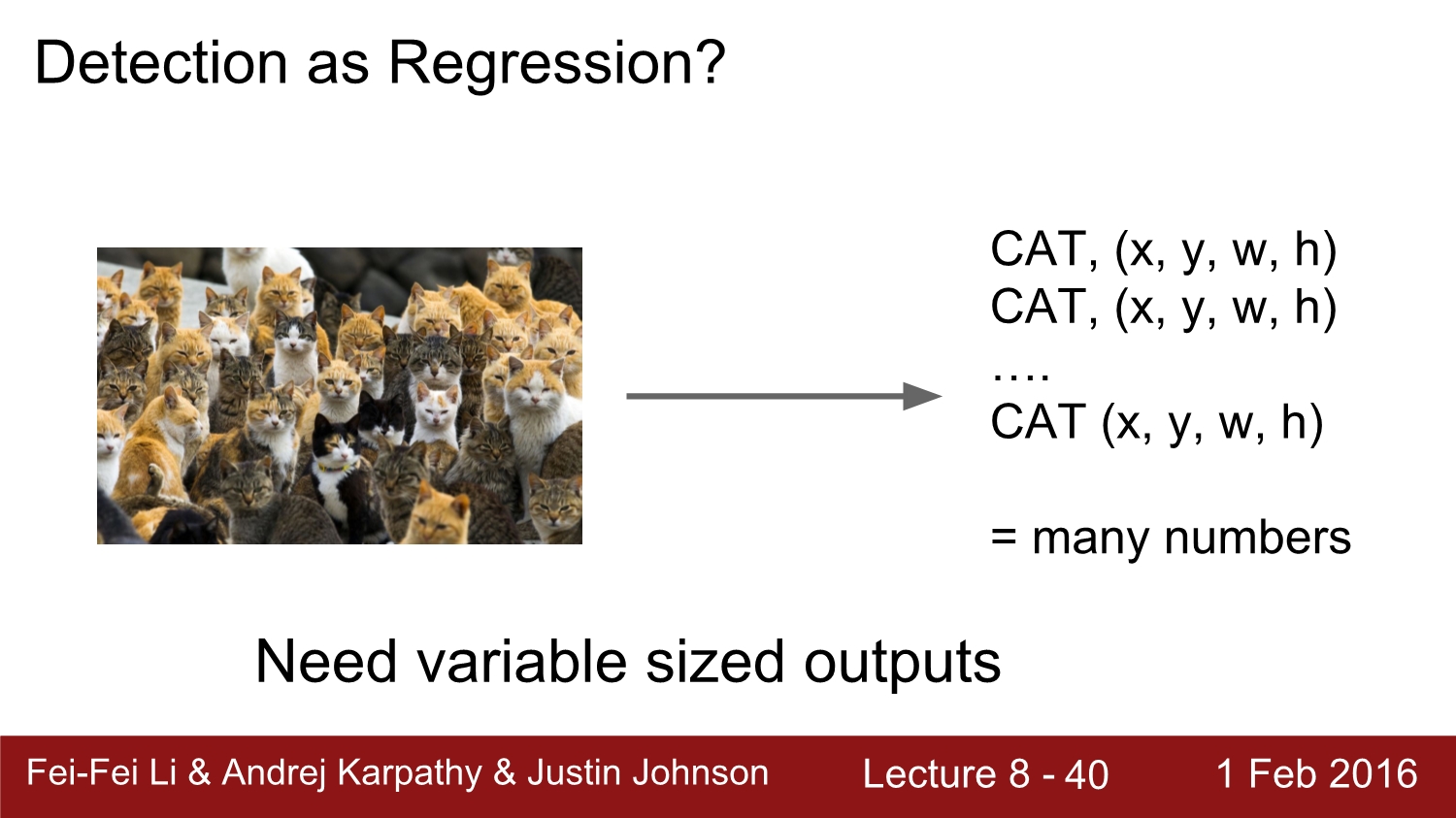 하지만 object가 매우 많은 경우에는 4n개의 output이 나오게 된다. 이러한 이유 때문에 많은 object를 detection 하는 problem에서는 regression이 적당하지는 않다. 하지만 나중에 배우게 되는 YOLO에서는 regression을 사용하여 object detection을 진행하였다.