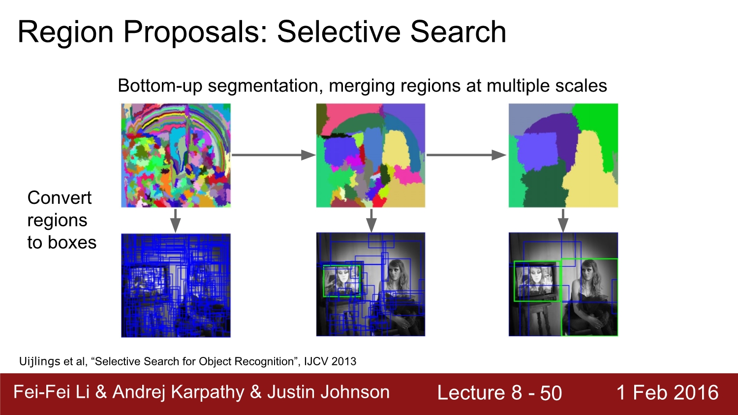 위 방법은 region proposal 방법 중하나인 selective search이다. 픽셀에서 진행하고 비슷한 픽셀끼리 클러스터링 한다. 그 후 알고리즘을 사용하여 더 큰 blob을 만들게 된다. 최종적으로는 맨 왼쪽 아래와 같은 box가 나오게 된다. 장점은 모든 영역을 계산하지 말고 박스 영역에 대해서만 계산하면 된다.