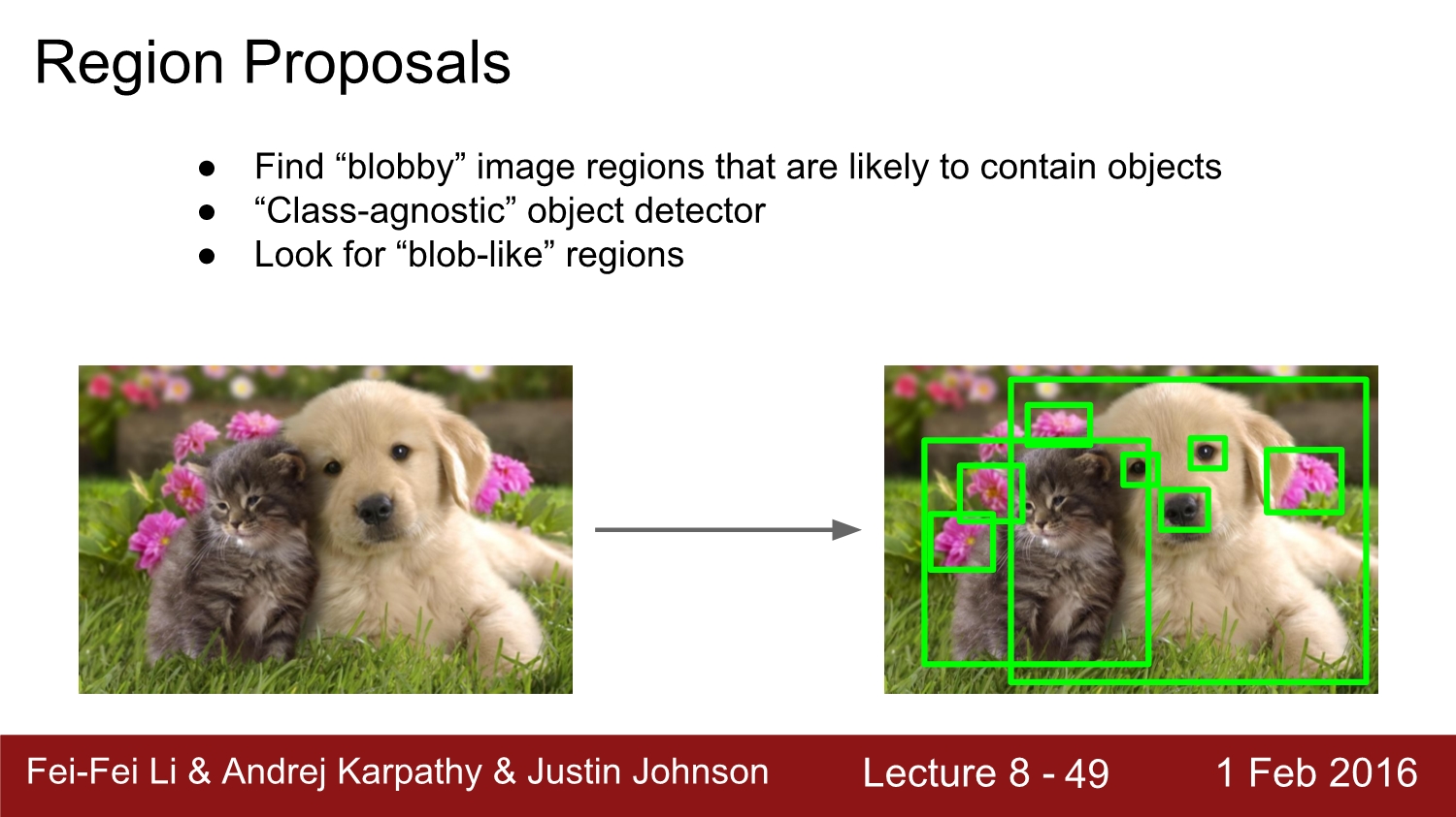 위 이미지를 보게 되면 object를 포함할 것 같은 이미지의 영역을 찾은 것을 볼 수 있다. 이 것들을 blob이라고 하는데 유사한 색이나 texture를 갖는다. blob 한 region을 찾는 과정에서는 정확도를 신경 쓰지 않는다. 따라서 매우 빠르게 동작하고, 결과적으로 보았을 때는 오른쪽 이미지처럼 된다.