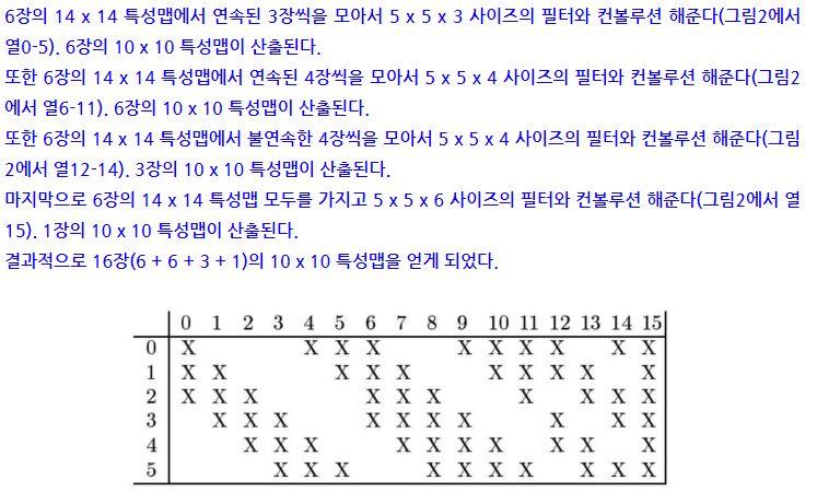 3) 다음은 C3 layer이다. 여기서는 14*14 activation map에 convolution 연산을 한 후 총 16장의 10*10 activation map을 얻게 된다. 여기서 16장을 얻는 이류는 아래를 참고하면 된다.