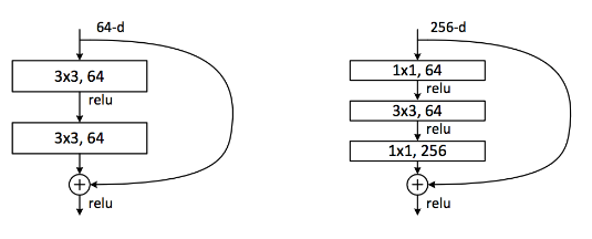 또한 ResNet은 점점 깊어질 수록 parameter의 개수가 늘어나 50층 이후부터는 bottle neck을 도입한 오른쪽과 같은 구조를 사용합니다. 이를 bottleneck block이라고 부릅니다.