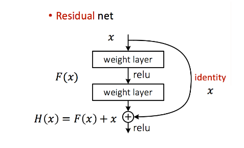 기존의 layer와 달리 shortcut connection은 위 그림처럼 layer 2개를 건너뜁니다. 따라서 layer에 들어온 x가 identity가 되어 일반적인 weight layer (convolution layer)의 출력 값과 element-wise addition을 합니다.