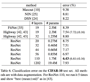 결과를 보게 되면 110 layer가 가장 error가 줄었지만, 1202 layer에서는 여전히 degration 문제가 발생하는 것을 볼 수 있습니다.