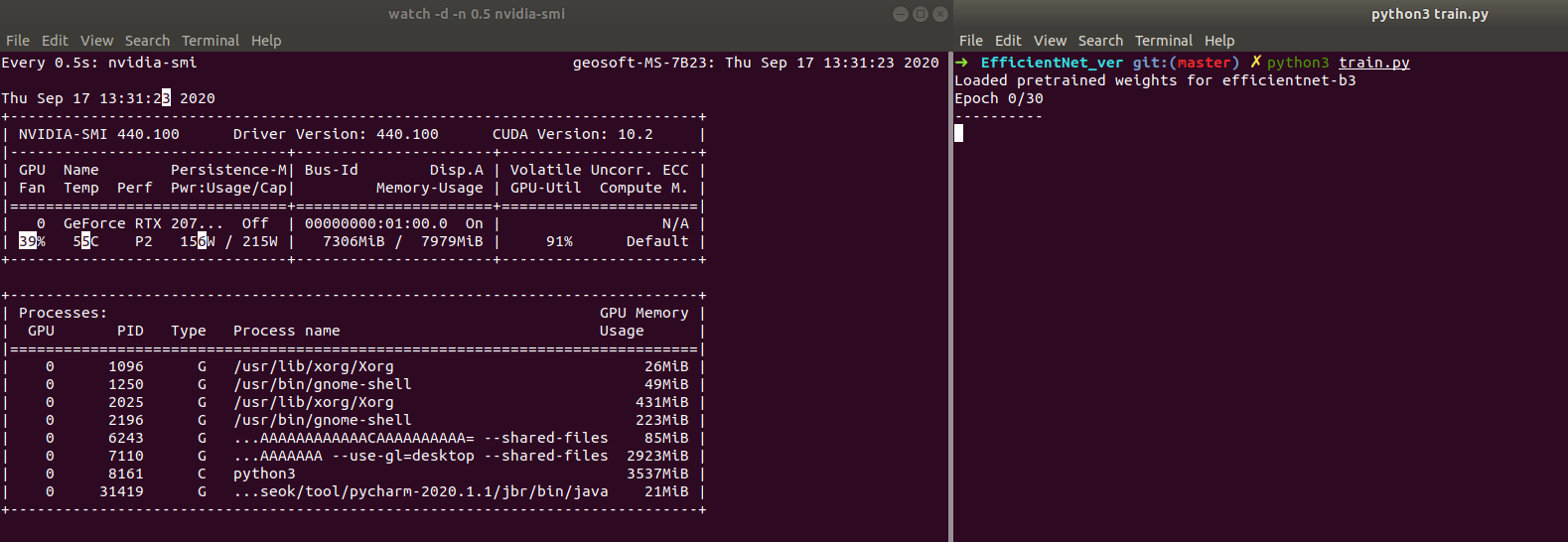 참고로 왼쪽 명령어는 watch -d -n 0.5 nvidia-smi이다. 이를 사용하면 실시간으로 gpu 사용량을 확인할 수 있다.