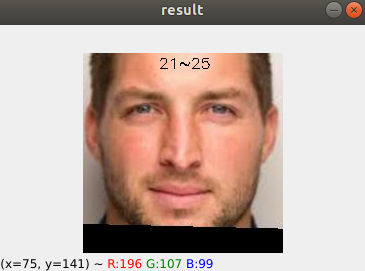 cv2.putText(ori_img, str(age_dict[preds.item()]),(75, 15), fontFace=cv2.FONT_HERSHEY_SIMPLEX, fontScale=0.5, color=(0,0,0))