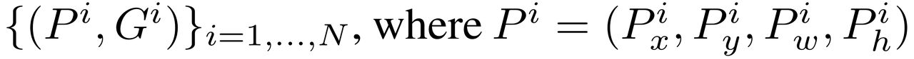 위 식을 설명하자면 우선 x,y는 해당 좌표, w,h는 너비와 높이를 뜻한다., 그리고 P는 선택된 bouding box이고, G는 실제 정답인 bounding box이다. 여기서 P를 최대한 G에 가깝게 학습하는 게 이 알고리즘의 목표이다.