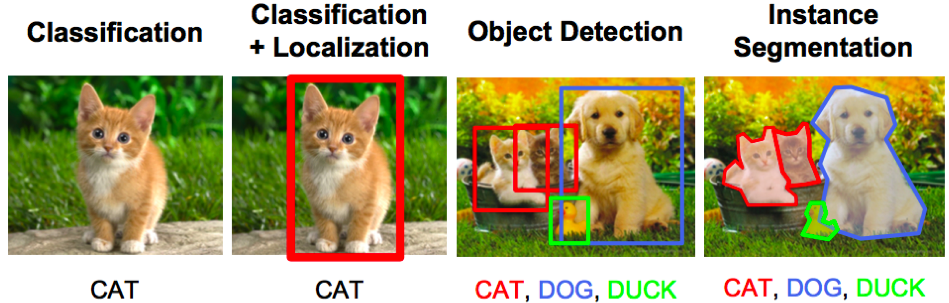 이전 분석했던 Alex net, Le net-5는 모두 classification problem를 해결하고자 만들어진 네트워크다. Computer vision에서의 problem 분야는 크게 4가지로 정의할 수 있다. 우선 첫번째로 지금까지 살펴본 classification 즉 이미지를 보고 어떤 물체인지 인지하는 문제, 두번째는 Classification + Localization이다. 이는 해당 물체를 인지할 뿐만 아니라 boundary box를 통해 해당하는 위치 좌표까지 반환한다. 이 두개의 문제들은 여러 개의 물체를 한번에 찾지 못한다는 단점이 존재한다. 하지만 세번째인 object detection는 앞서 설명한 Classification + Localization에서 발전해 다중 물체를 인식할 수 있다. 그리고 마지막인 Instance Segmentation은 object detection에서 더욱 발전해 각 객체를 구별할 수 있게 만드는 문제이다.