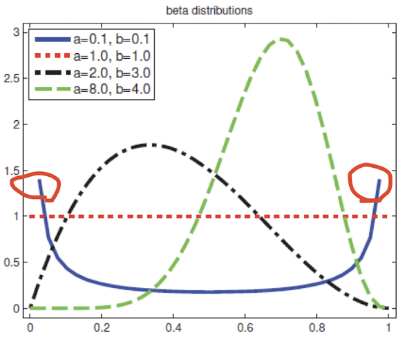 만약 $a, b <0$ 이라면 0과 1 사이에 있는 spikes 성질을 갖는 bimodal distribution이 된다.