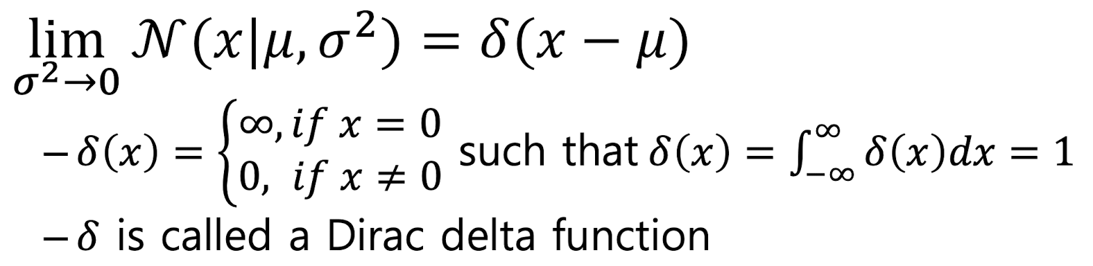 Gaussian distribution에서 $\sigma^{2} → 0$일 때, spike의 형태처럼 가운데가 높고 폭이 좁아지는 형태가 된다. 이와 같은 상황은 Dirac delta function과 함께 다음과 같이 수식으로 표현할 수 있다.