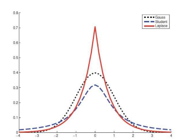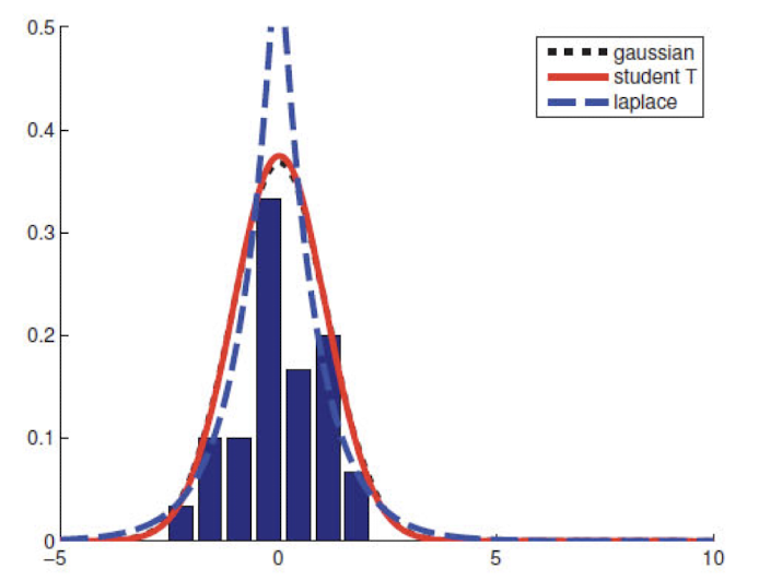 Gaussian, student’s t, laplace의 분포를 비교해보았을 때 우선 3개의 분포 다 평균이 0이다. variance만 조금씩 다르다.