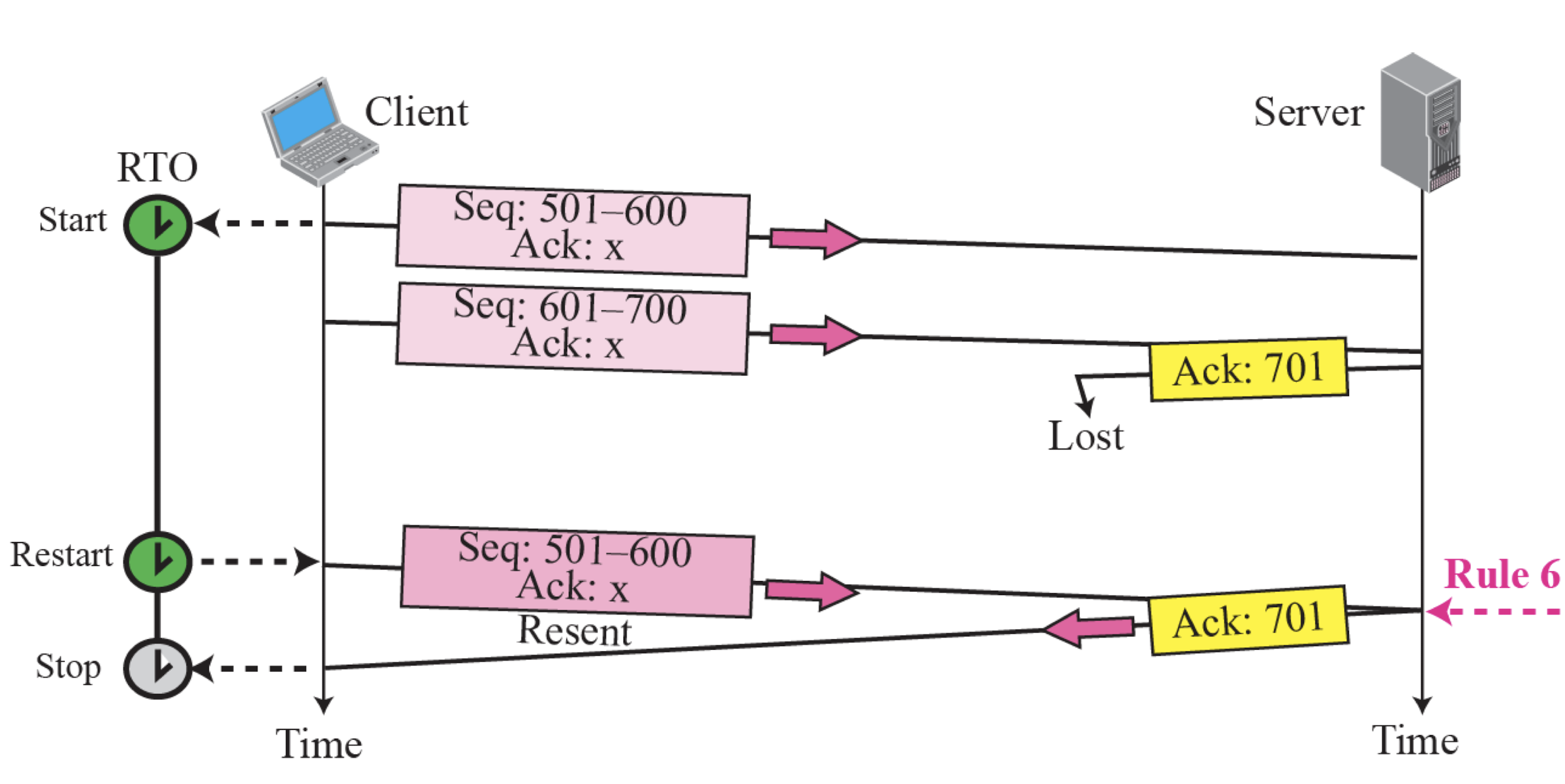Rule 6도 응급 상황이다. ACK이 없어진 상태인데, sender는 time out이나 중복된 ACK으로 오류 검사를 하는데, 이것은 time out으로 알게 된 경우이다. 따라서 501번에 대한 패킷을 재전송한다. (사실은 어떤 패킷이 없어졌는지 모르기 때문에 501, 601 둘 다 보낸다.)