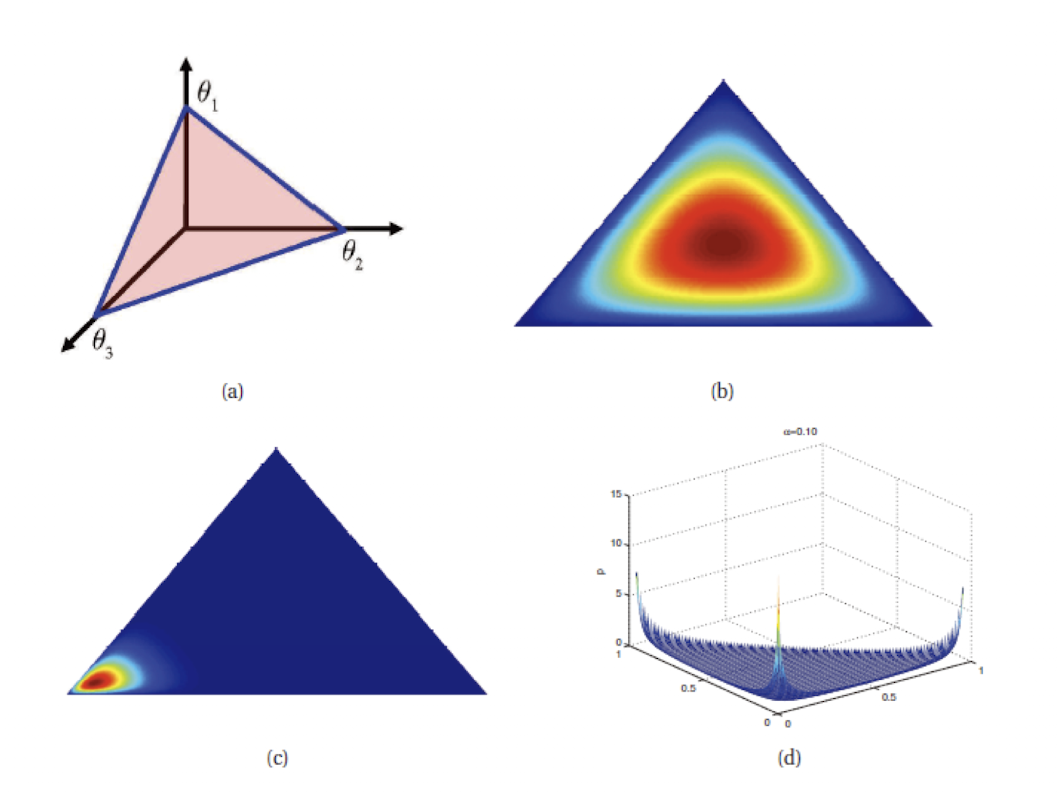 모든 $K$에 대해 $\alpha_{K} < 1$ 이면 simplex의 모서리에 spike가 나타난다. 정리하자면 \alpha_{K} 값이 증가하면 $\text{var}[x]$이 감소하는 것을 볼 수 있다.