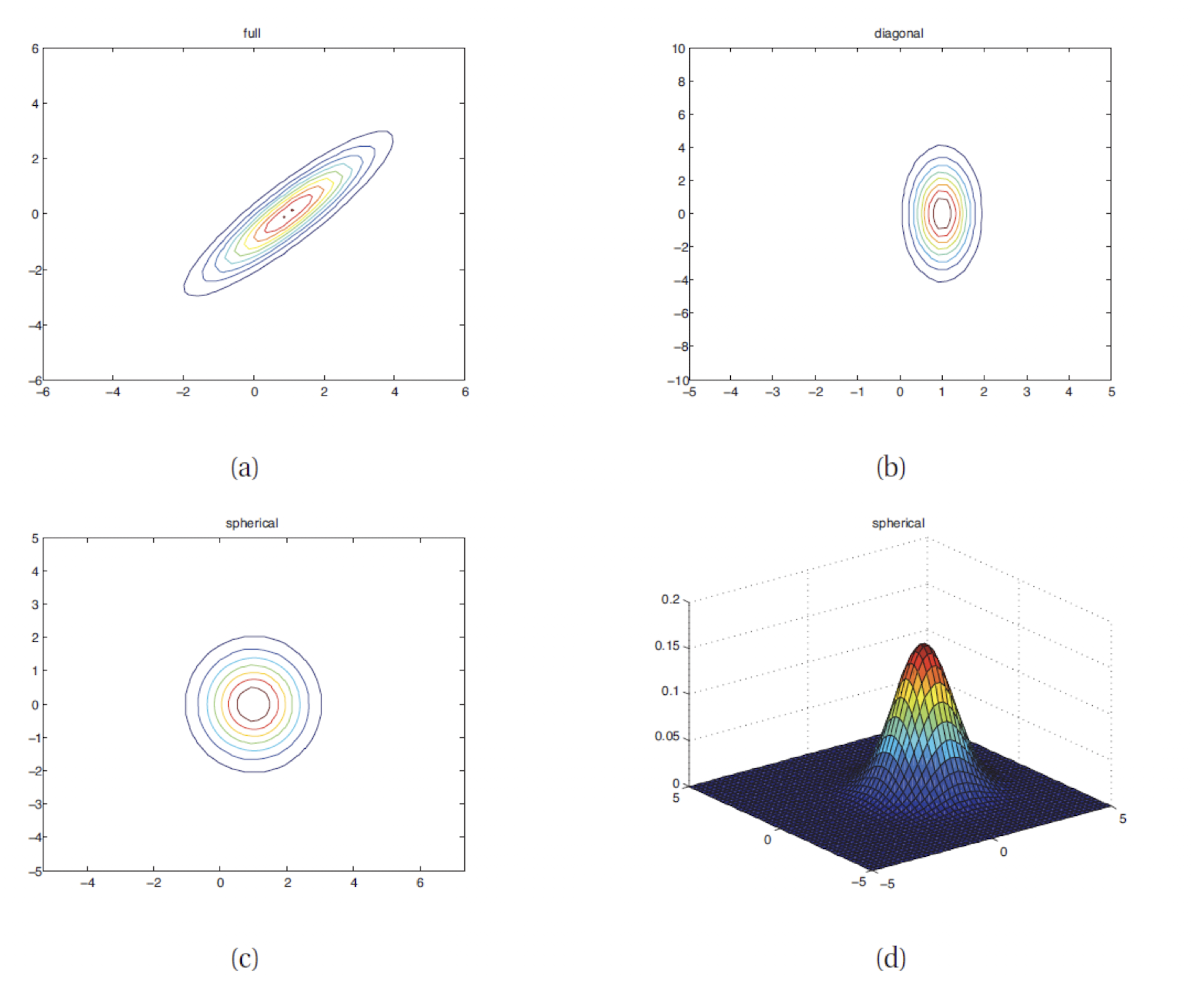 그림에서 (a)는 Full covariance인데 이를 시각화하면 타원형 등고선의 모습을 볼 수 있다. (b)는 Diagonal covariance인데 축으로 정렬된 타원과 같이 시각화되고, (c)인 spherical covariance matrix는 원형의 모습을 한 것을 볼 수 있다. (d)는 spherical Gaussian의 surface plot이다.