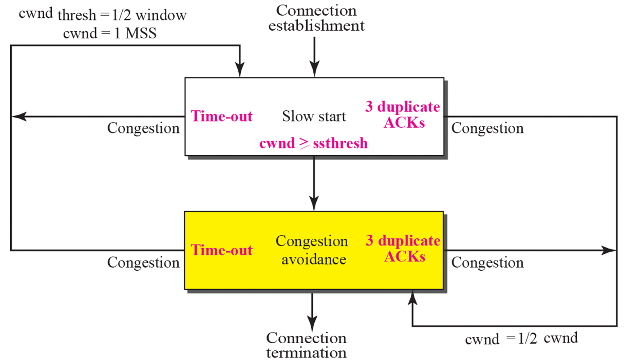 위에서 살펴본 바와 같이 연결이 성립되면 slow start를 통해 2배씩 window size를 증가시키고, sshtresh를 만나게 되면 멈춘다. 이때 딱 정해진 window size에서 멈춘다. 그 후 Congestion avoidance 과정이 되는데, 여기서는 additive increase를 한다. 여기서 혼잡이 발생하게 되면 window size를 절반으로 줄인다. 이게 일반적인 상황이다.
