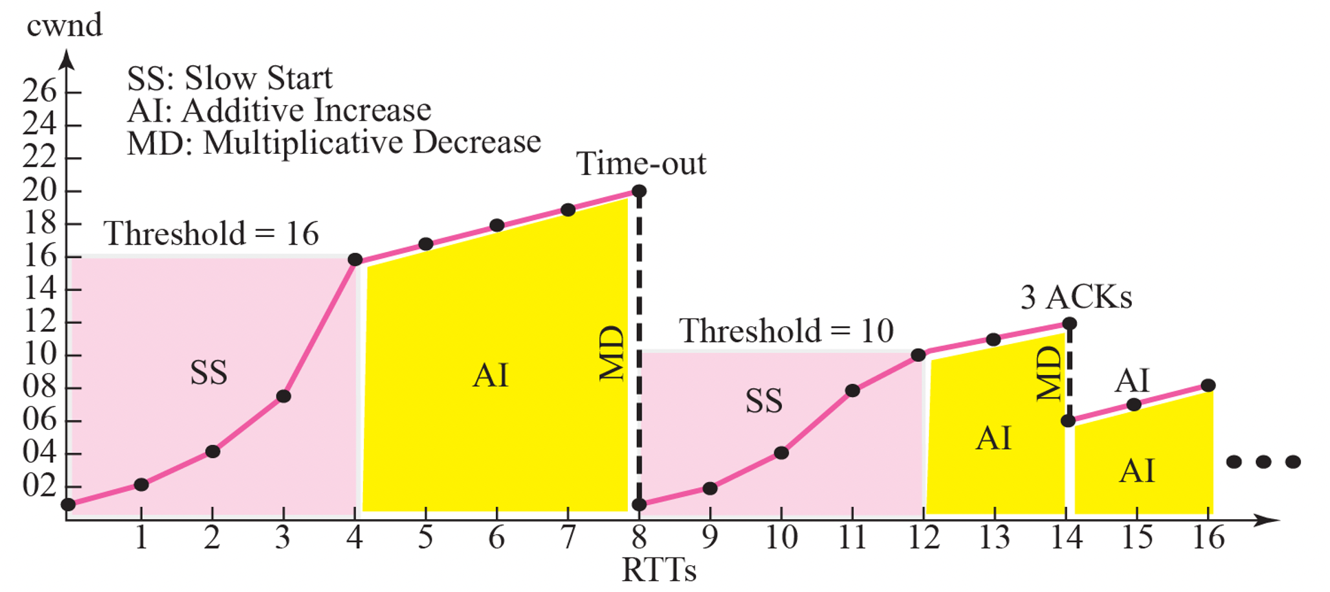 SS는 조금 있다가 살펴보고 다음 AI (Additive Increase)를 보자 10, 11, 12까지 증가 시킨 후에 packet loss가 생긴 상황이다. 이때 CWND를 절반으로 줄인 후 다시 AI를 한다. 이렇게 하는 것을 AIMD라고 줄여서 말한다. 늘리는 것은 천천히, 줄이는 것은 절반으로의 의미를 갖는다.