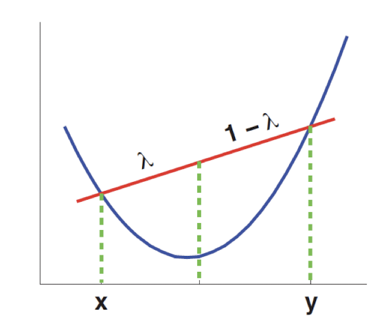 convexity는 optimization과 연관이 있다. convexity를 통해 최적화된 $argmin{f(\theta)}$를 찾는다. 어떤 function이 optimization에 수월하게 되려면 convexity가 높아야 한다. convext의 정의는 다음과 같다.