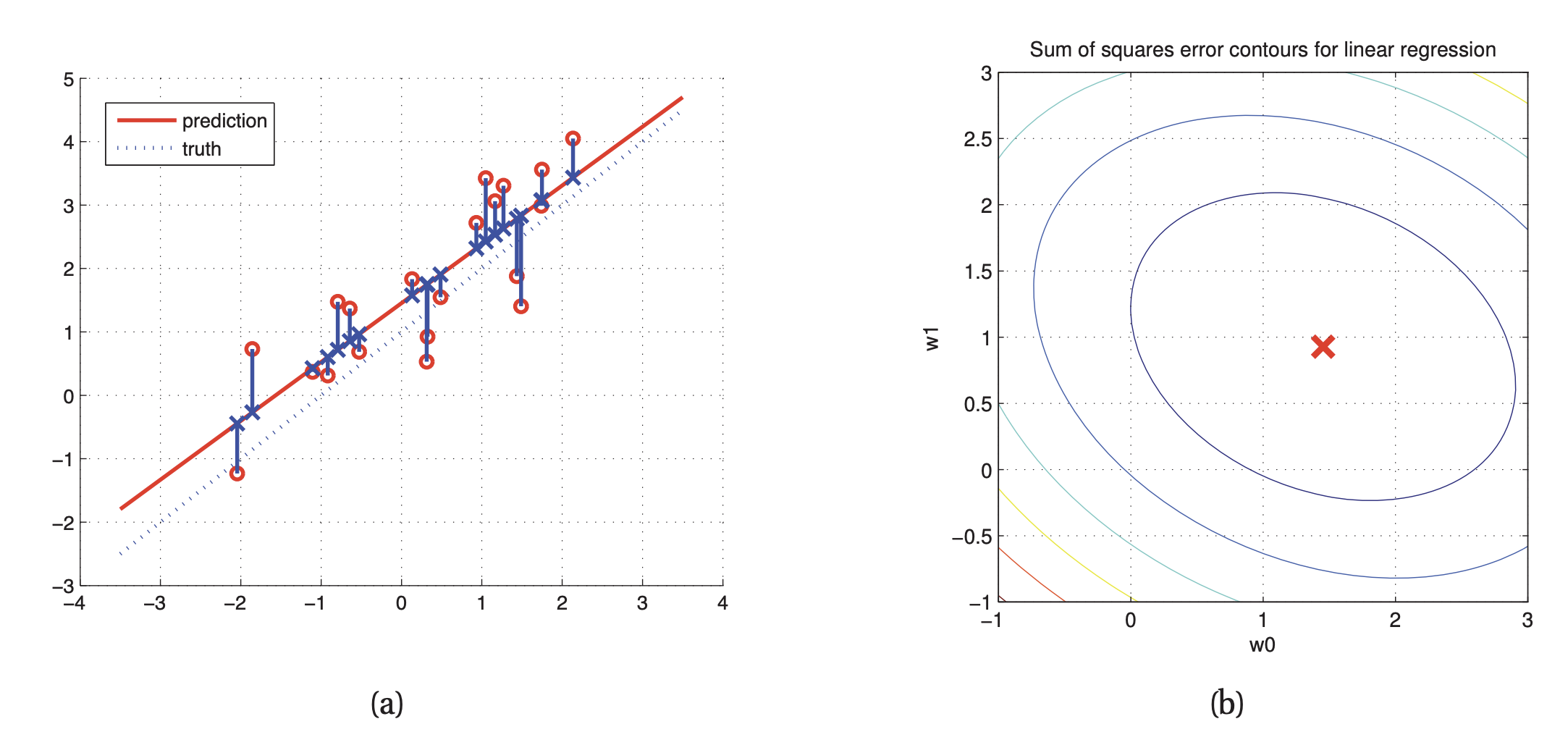 (a)는 linear least squares에서 training point (빨간 원)으로부터 distance의 합들이 최소화되는 지점 (파란색 point 부분)을 찾아 regression line을 표현한 그림이다. regression line을 통해 error를 최소화할 수 있다.