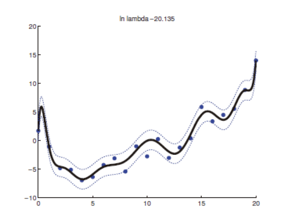 일반적으로 Gaussian prior를 model의 parameter에 추가하여 이를 작게 만드는 것을 $l_{2}$ regularization 또는 weight decay라고 부른다. 알아두어야 할 것은 offset term (혹은 bias term)인 $w_{0}$ 은 함수의 높이에만 영향을 미치고 model complexity에는 영향을 주지 않기 때문에 regularization 하지 않는다.