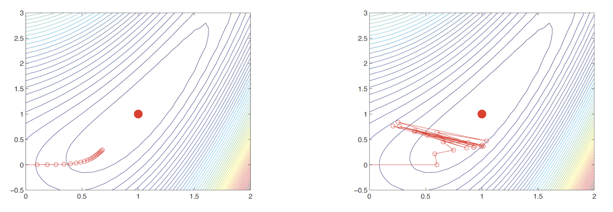 여기서 $\eta_{k}$는 step size 또는 learning rate를 의미하고, $g_{k}$를 통해 갱신에 대한 방향성을 결정한다. Gradient Descent에서 가장 큰 issue는 step size을 어떻게 결정해야 되는지이다. step size가 작으면 작게 갱신이 되고, 크면 이상한 방향으로 갱신될 수 있다.