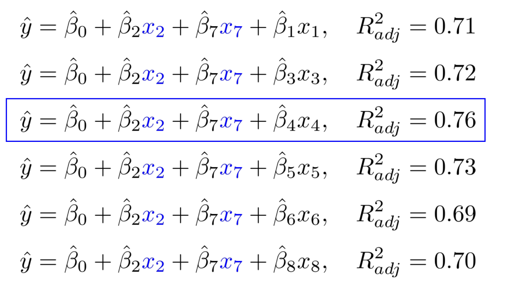 $$ \hat{y} = \hat{\beta_{0}} + \hat{\beta_{2}}x_{2}+ \hat{\beta_{7}}x_{7} + \hat{\beta_{4}}x_{4}, \ \ R^{2}_{adj}=0.76 $$