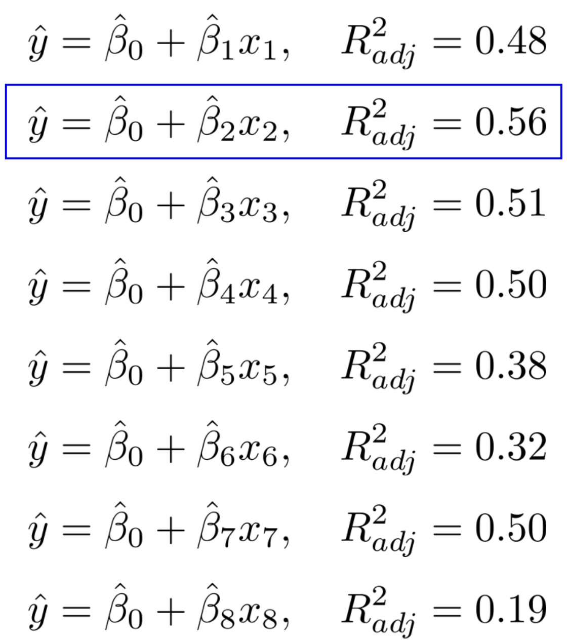 $$ \hat{y} = \hat{\beta_{0}} + \hat{\beta_{2}}x_{2}, \ \ R^{2}_{adj}=0.56 $$