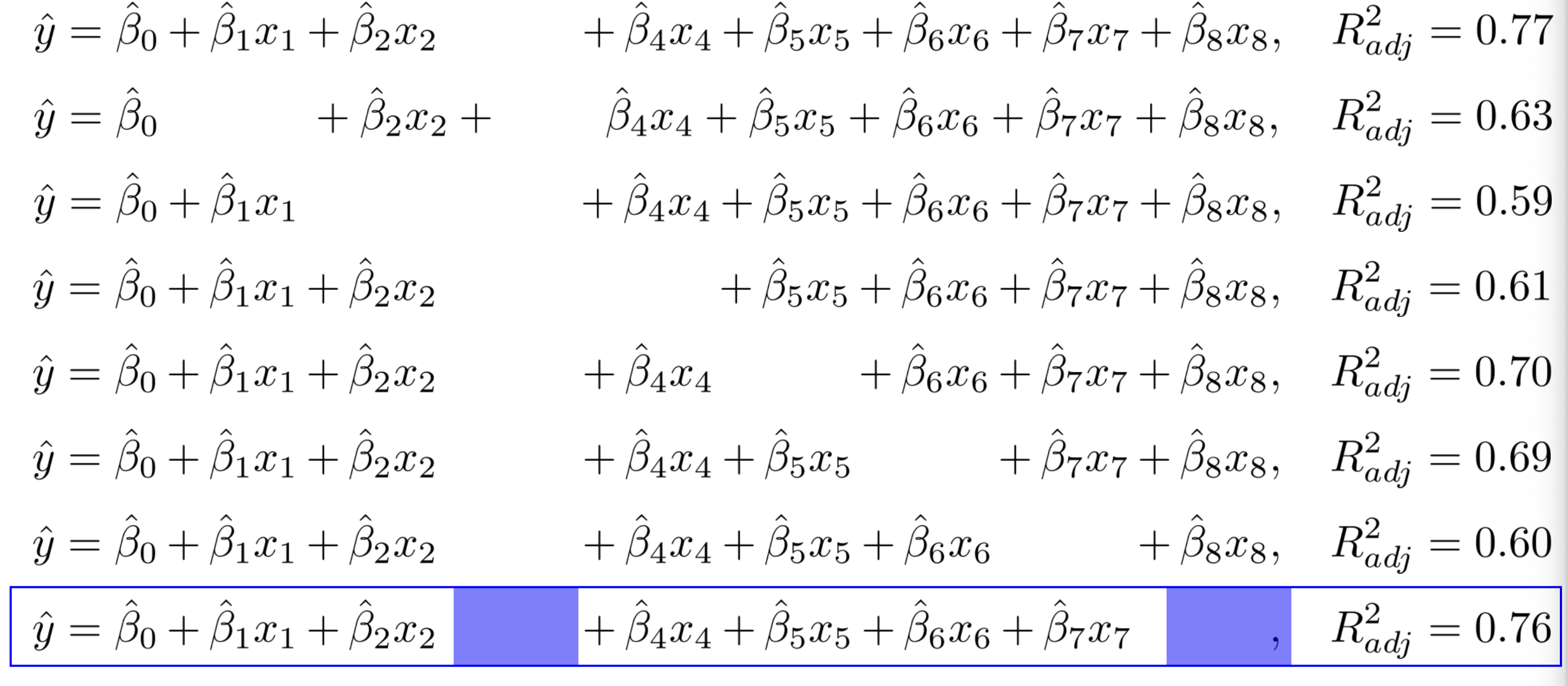 $$ \hat{y} = \hat{\beta_{0}} + \hat{\beta_{2}}x_{2}+ \hat{\beta_{7}}x_{7}+ \hat{\beta_{4}}x_{4}, \ \ R^{2}_{adj}=0.76 $$