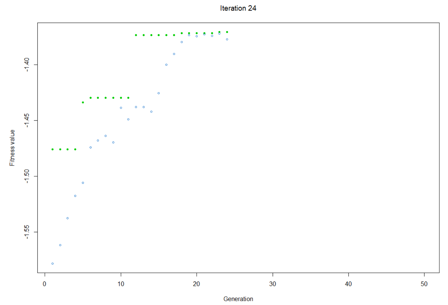위 plot의 초록색 point는 best chromosome에 의해 선택된 변수들의 예측 성능이다. 하늘색 point는 해당 세대 chromosome의 평균 성능을 보여 준다.