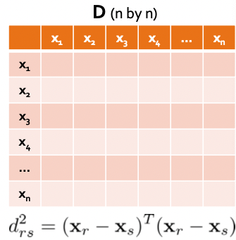 $$ d_{rs}^{2}= (\mathbf{x}{r}-\mathbf{x}{s})^{T}(\mathbf{x}{r}-\mathbf{x}{s}) $$