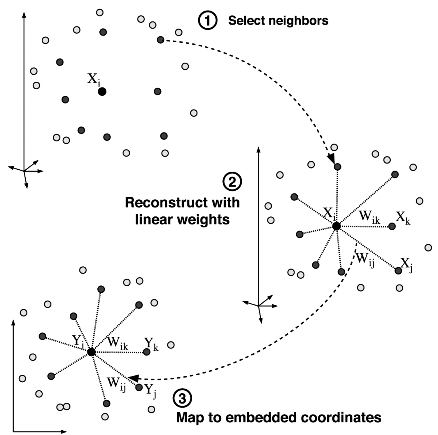 여기서 original data는 $\mathbf{x}{i}$이고, $\mathbf{x}{j}$는 이웃이고, 가중치는 original data를 재구축하기 위해 이웃에 부여되는 가중치이다.