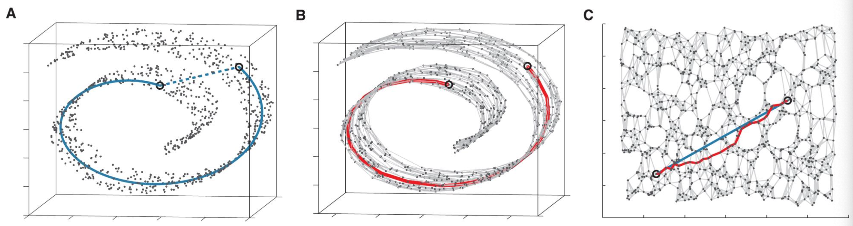 이를 하려면 A에서 B로 graph 형태로 변환한다. 그리고 나서 가까운 이웃들을 따라가다 보면 목적지에 도달하게 된다. C와 같은 그림을 manifold라고 하는데, 우리는 정확한 직선을 찾지 못해서 약간은 돌아가지만 빨간 선처럼 최대한 최단 거리를 구하는 것이다.